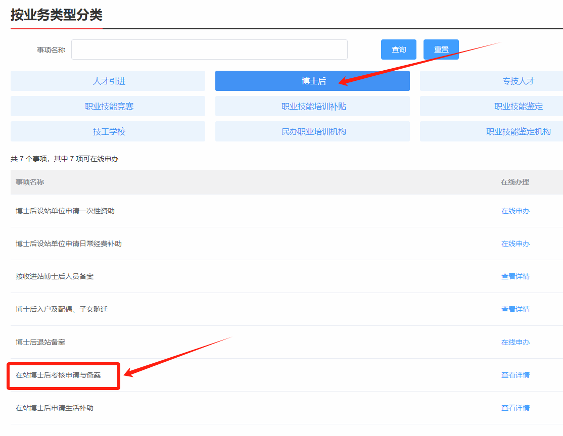 (4)业务入口:登录上述网址——点击左侧“首页”——业务模块点击“博士后”——点击“在站博士后考核申请与备案”