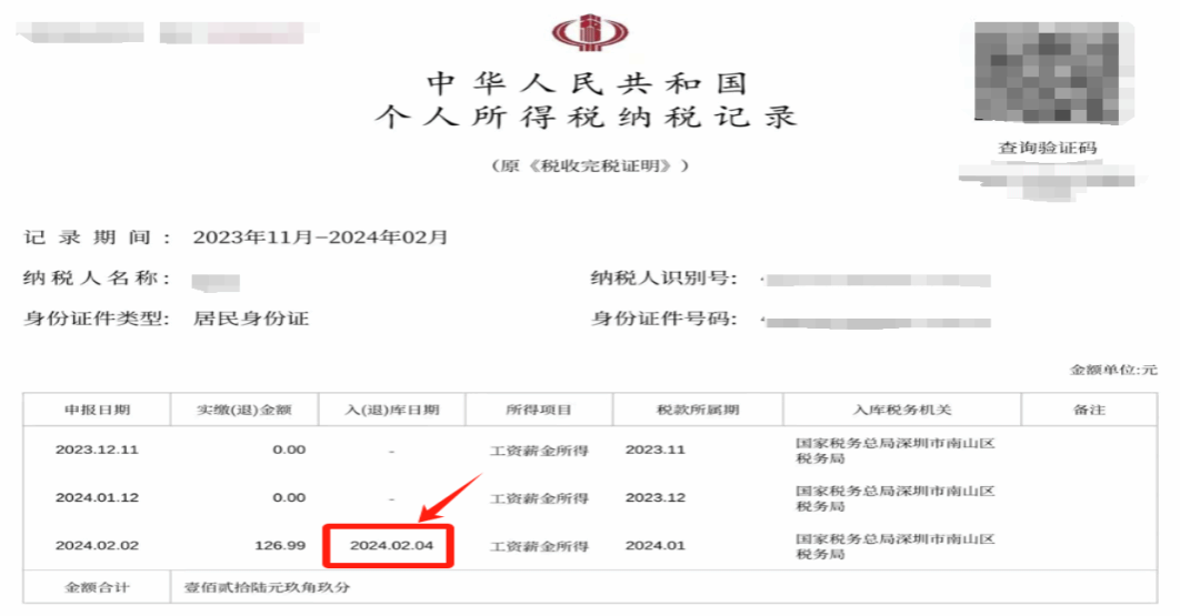 备注:中期考核生活补助申请要求提供近12个月以上的纳税记录,且“入(退)库日期”处已显示日期(零纳税申报记录除外),视为有效材料(示例见下图)。